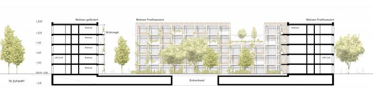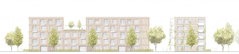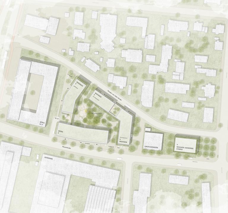 "Die Verfasser schlagen eine durchgängige 5-geschossige Blockrandbebauung vor. Der Blockrand wird bewusst durch zwei Fugen getrennt und geöffnet. Eine zu öffentliche Durchwegung des Innenhofs wird durch die Orientierung der Wohnungen abgemildert. Der Kubus wird durch zwei weitere Einschnitte gegliedert, die zusätzlich Dachterrassen für die Bewohner bilden. Das Abknicken des Gebäudes im Nordwesten ist für die Qualität der Wohnungen sehr gut nachvollziehbar. Der vorschlagen Treffpunkt im Südosten des Realisierungsteils ist städtebaulich gut gewählt und wird logisch ergänzt durch eine Cafénutzung im Erdgeschoss."