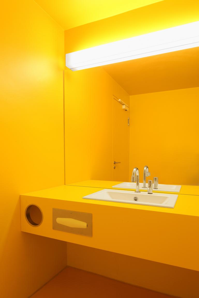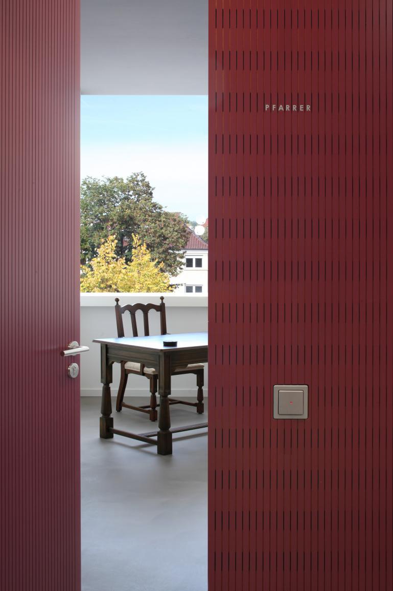 Farbig gestaltete Oberflächen führen von Außen nach Innen und verbinden die Erschließungsbereiche in allen Geschossen. Aus dem erdigen Rot der Erschließung tritt man in die hellen Aufenthaltsräume.
