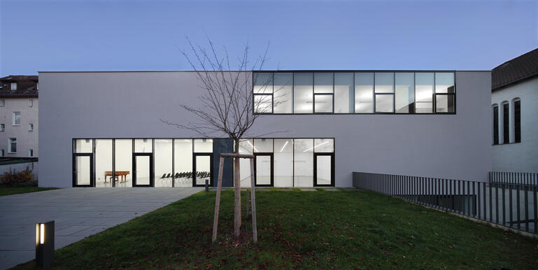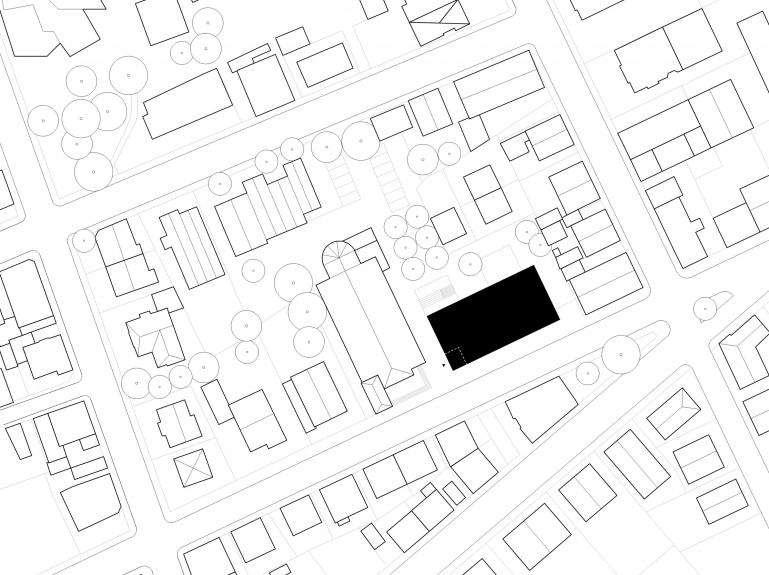 Der klare Baukörper ist als eigenständiges Element in die heterogene Straßenbebauung eingefügt und baut durch die Ausrichtung des Eingangs eine starke Beziehung zur Kirche auf. Durch die weitgehende Schließung des Straßenraums schirmt der Neubau den Freiraum im rückwärtigen Bereich des Grundstücks vom Straßenlärm ab.