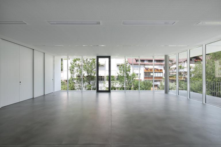 Mithilfe von mobilen Trennwänden kann der Großraum in vier Räume unterteilt werden und ist damit flexibel für unterschiedliche Gruppen nutzbar. Die dienenden Funktionen Küche, Stuhllager und Sanitärbereich sind in massiven Kernen um den Saal angeordnet. Die Küchentheke kann für Bewirtungszwecke über Schiebewände zum Saal geöffnet werden. Ein Balkon mit anschließender Terrasse erweitert im Sommer die Nutzfläche für Gemeindeveranstaltungen.