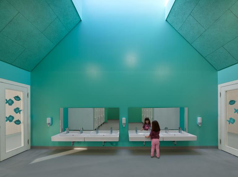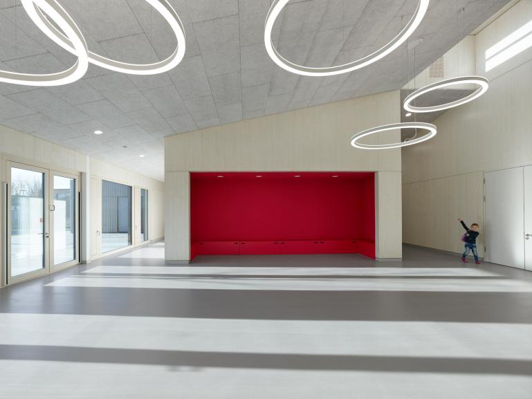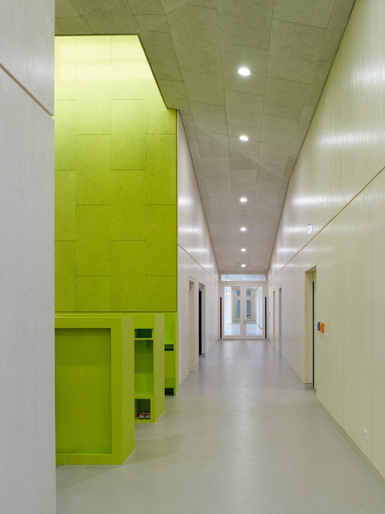 Eine zentrale Halle mit Oberlicht ist der Mittelpunkt des Hauses und dient als Verteiler in die Räume. Ein Kern beinhaltet die Nebenräume. Die Funktionsräume werden um die Halle entlang der Fassade angeordnet. Der Eingangsbereich des Gemeinschaftshauses dient als gemeinsames Foyer und als Gelenk für die beiden Kinderhäuser. Diese verfügen jeweils über eigene Garderobenbereiche, die wiederum von oben belichtet eine zentrale Orientierungsfunktion übernehmen.