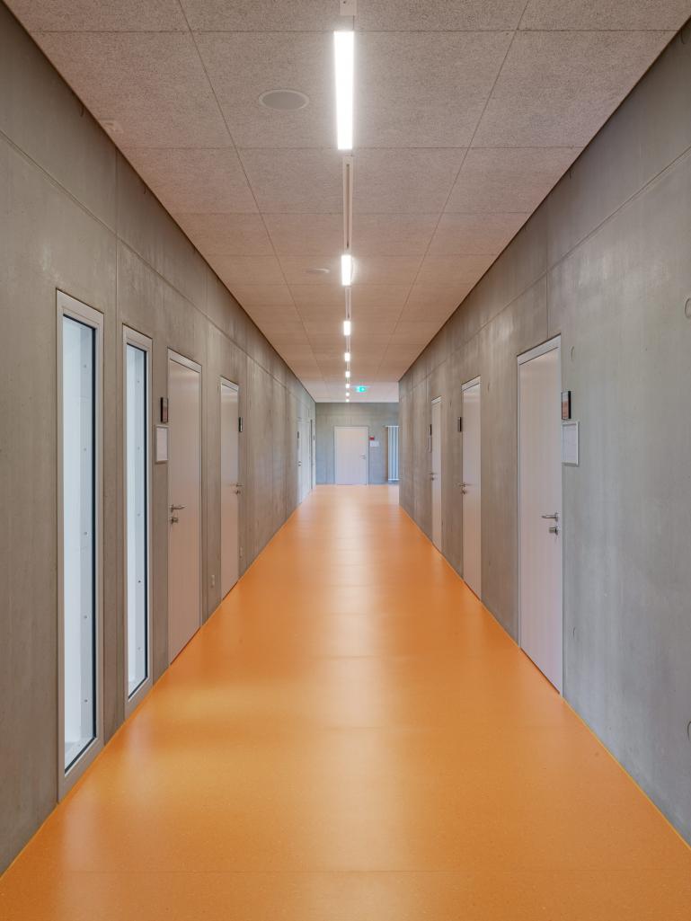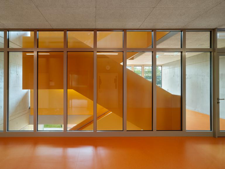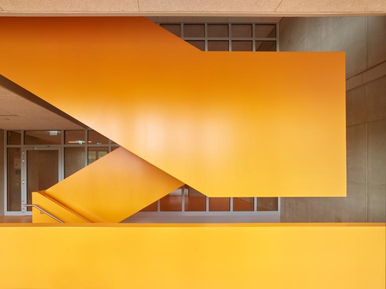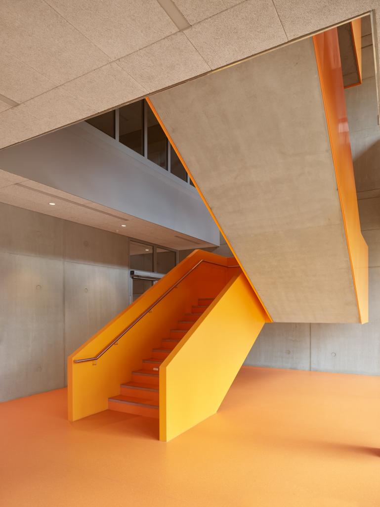 Im Kontrast dazu steht die farbige Gestaltung besonderer Flächen: Pausenhof, Mensaraum und Erschließungsflächen erhalten orangefarbene Böden, um deren öffentlicheren Charakter gegenüber den eher neutral gehaltenen und intimeren Klassenräumen deutlich zu machen. Die großzügige Treppe neben dem Haupteingang. windet sich wie eine große farbige Skulptur durch das Haus und stellt den Bezug zu den im selben Farbton gestalteten Erschließungsflächen her.
