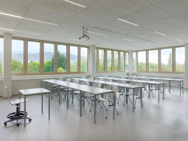 Die Obergeschosse sind wirtschaftlich und flächeneffizient als zweibündige Anlage konzipiert.Im 1. Obergeschoss befinden sich in erster Linie die Betreuungs- und Aufenthaltsräume, im 2. Obergeschoss die Bibliothek und die Fachräume.