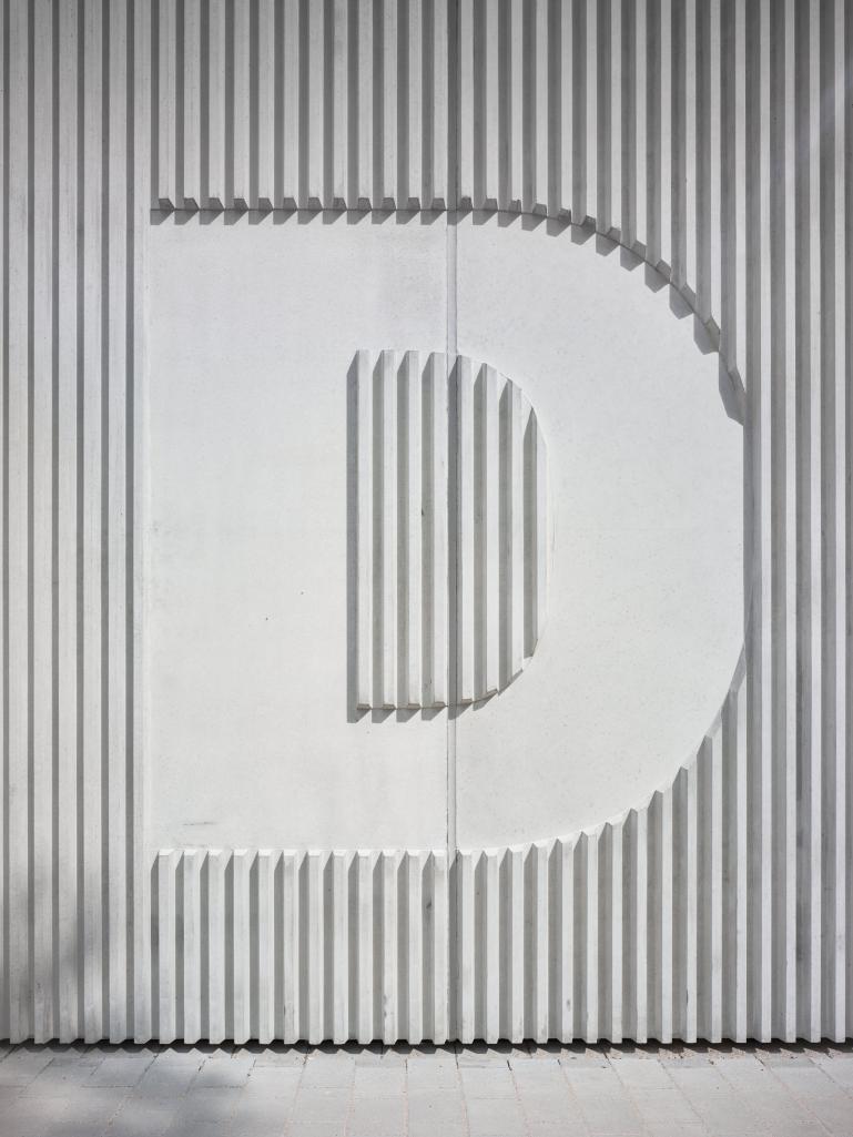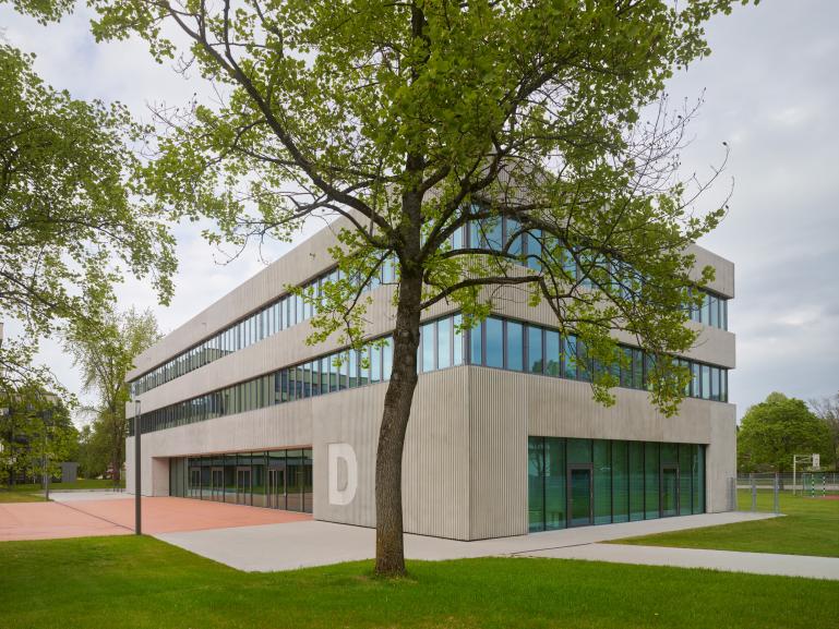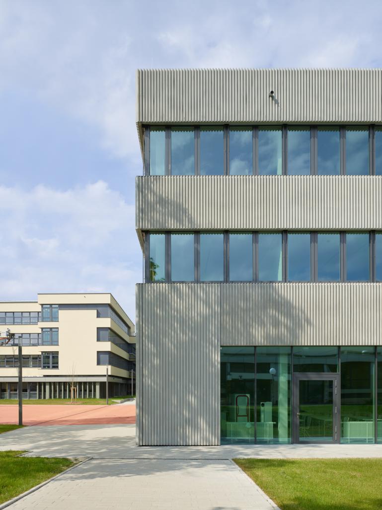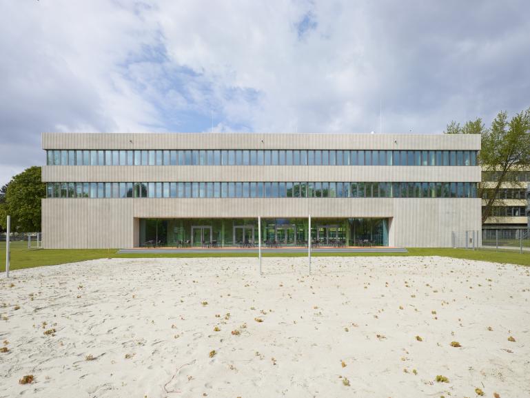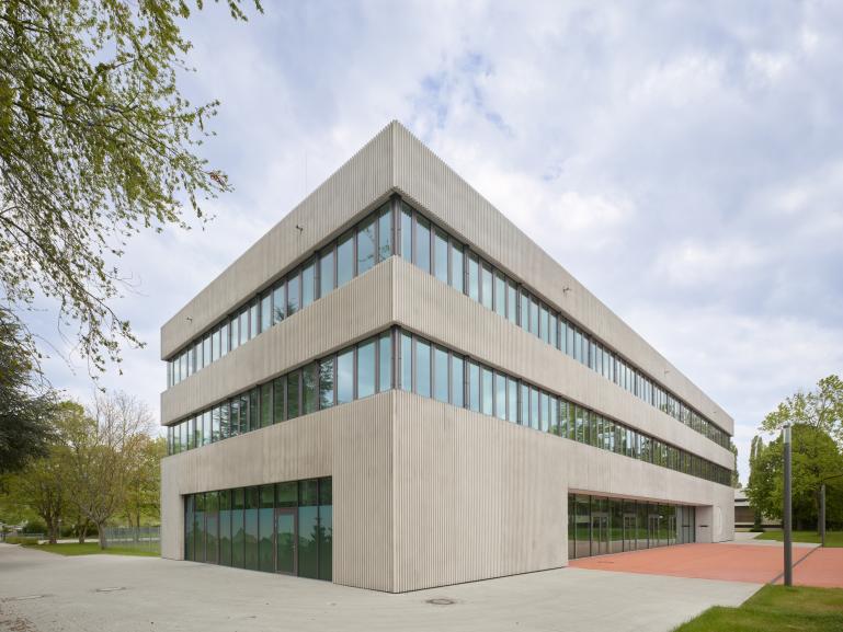 Der rationale Gestus des Neubaus korrespondiert auf einer grundsätzlichen Ebene mit der Architektur des Bestands. Die Bandfassade ist mit großformatigen, profilierten Betonfertigteilen ausgeführt. Die der Erschließungsbereiche sind ebenfalls in Sichtbeton ausgeführt.