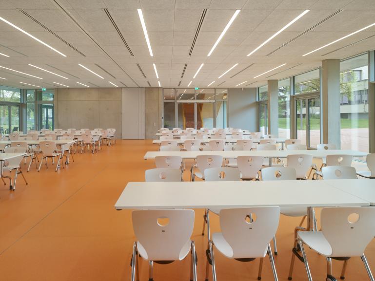 Das Foyer, die Mensa und der Konferenzraum liegen an zentraler Stelle im Erdgeschoss an der eingerückten, transparenten Fassade. Diese Funktionen können mittels mobiler Trennwände zusammengeschaltet werden und einen großen, stützenfreien Raum bilden, der sich durch das Gebäude hindurch nach beiden Seiten öffnet.