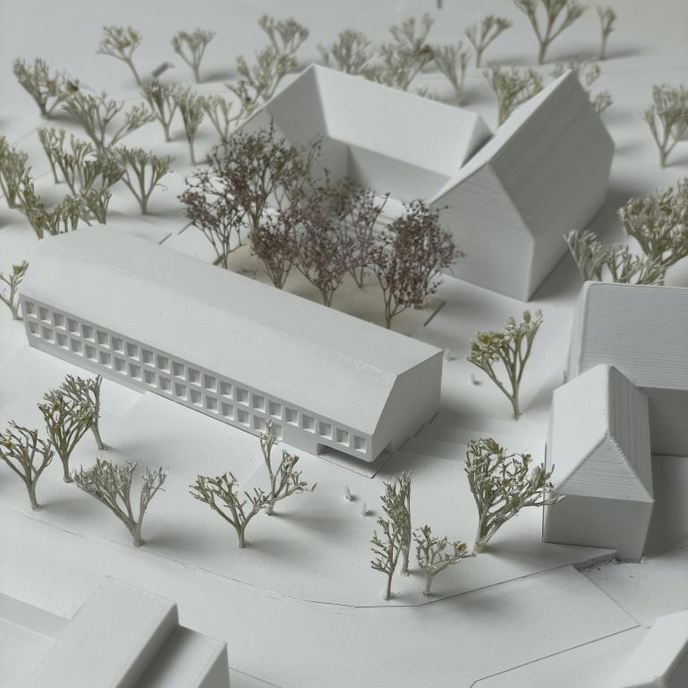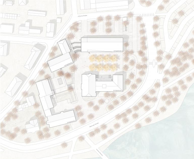 Die Ausrichtung des neuen Baukörpers parallel zum Amtsgebäude 3 schaffte einen neuen, autofreien Hof mit hoher Aufenthaltsqualität, der sich im Charakter vom Vorplatz zum Hauptgebäude abhebt. Er hält dabei ausreichend Abstand zum denkmalgeschützten Gebäude und gleichzeitig funktionale Nähe zum westlich angrenzenden Amtsgebäude 2.