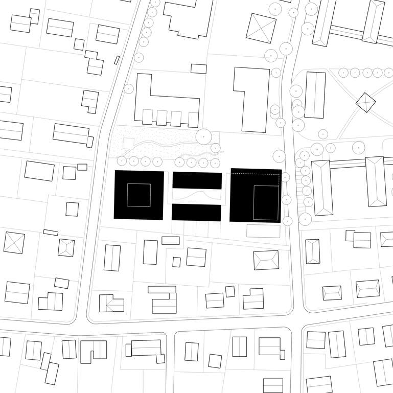 In einem heterogenen Gebiet aus den 50-er Jahren zwischen kleinteiliger Wohnbebauung und öffentlichen Gebäuden sollte eine neue Ortsmitte geschaffen werden. Die drei neuen, quadratischen Baufelder sind als zweigeschossige, flächige Bebauung konzipiert, um in ihrem Maßstab sowohl die öffentlichen Gebäude zu ergänzen, als sich auch der Höhe der Wohnbebauung anzupassen. Die Bebauung orientiert sich zu einer Parklandschaft, die eine Einbeziehung der bestehenden Sporthalle ermöglicht.