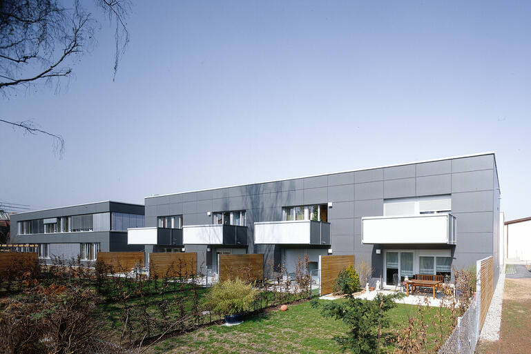 Um das Ensemble als Einheit zu stärken, werden die drei Gebäude in ihrer Materialität einheitlich behandelt. Zum öffentlichen Bereich hin zeigen sie sich mit dunklen Eternitfassaden. Großzügige Glasflächen zur Promenade stärken den öffentlichen Charakter.