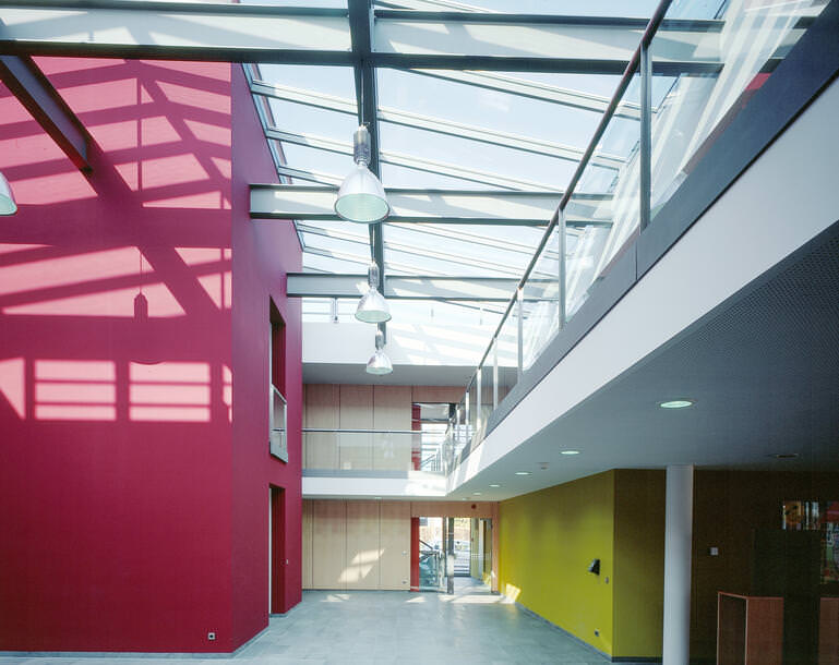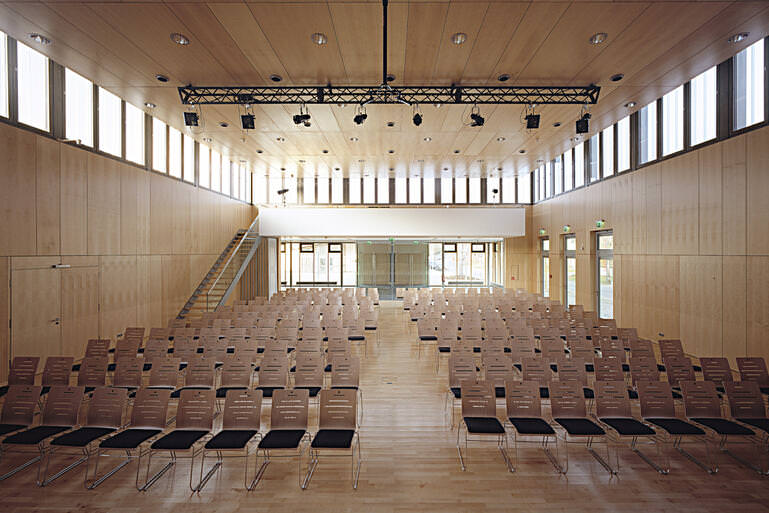 Das weit auskragende Dach lädt dazu ein, den Bürgersaal zu betreten. Über ein großzügiges Foyer gelangt man in den Saal, der als hölzerner Raum konzipiert ist. Als wichtigster Baustein des Ensembles erhält der Bürgersaal eine weithin sichtbare Oberlichtlaterne aus semi-transparenten Glas. Das Verwaltungsgebäude wird von der Promenade erschlossen. Es wird durch ein zentrales Atrium strukturiert und intern belichtet. In einem der nach Süden orientierten Wohnhäuser befindet sich zur Promenade im Erdgeschoss Einzelhandel. Zwischen den beiden Wohngebäuden liegt ein privater Garten mit Spielplatz.