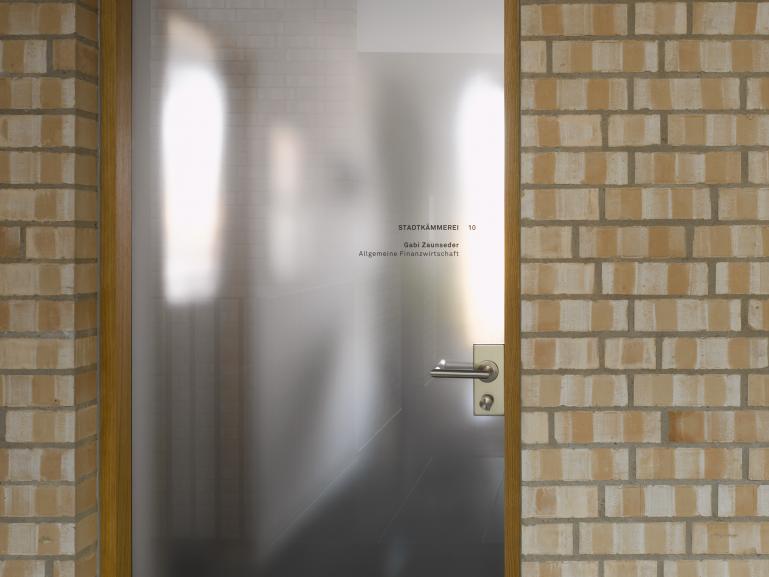 Exponiert über dem Eingangsbereich liegt der Sitzungssaal als Gegenüber des alten Rathauses.