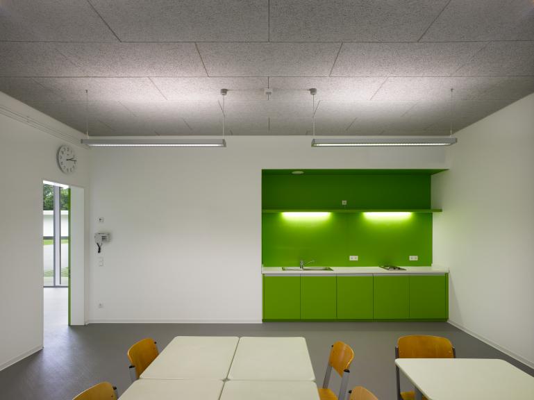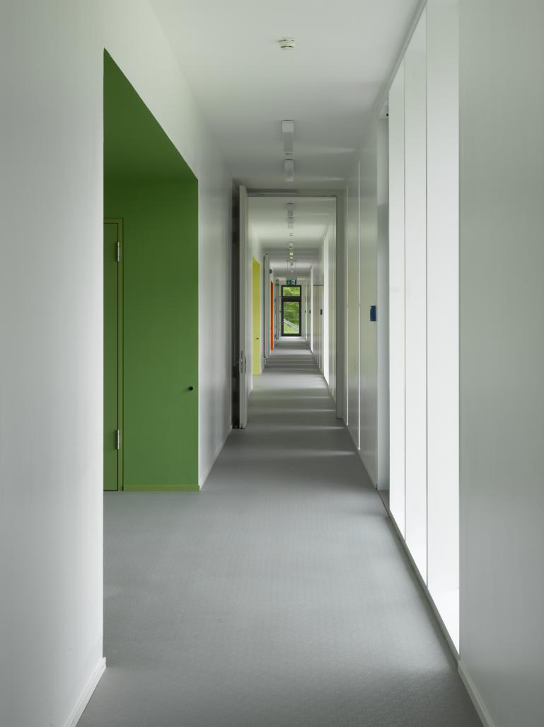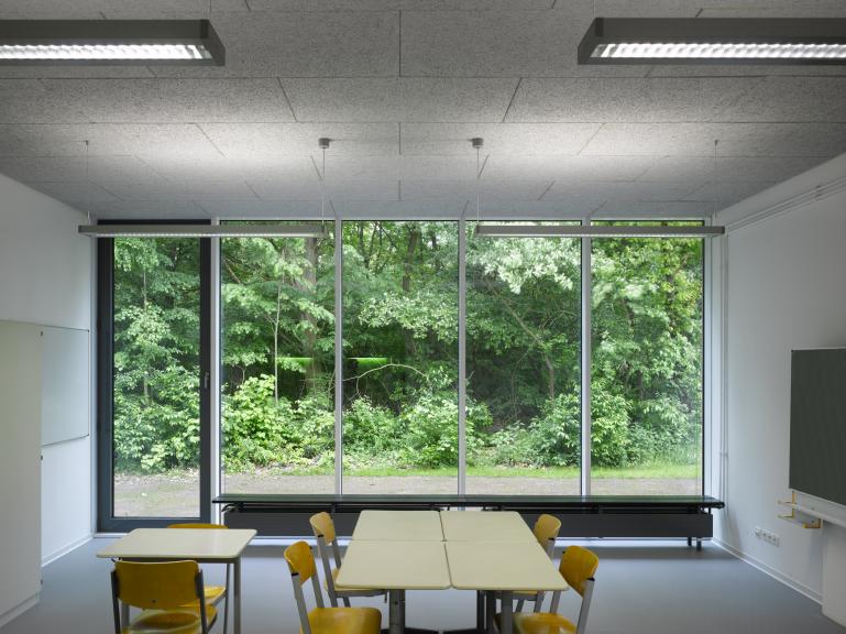 Die Lernräume besitzen eine großzügige Verglasung und öffnen sich damit zum Wald.