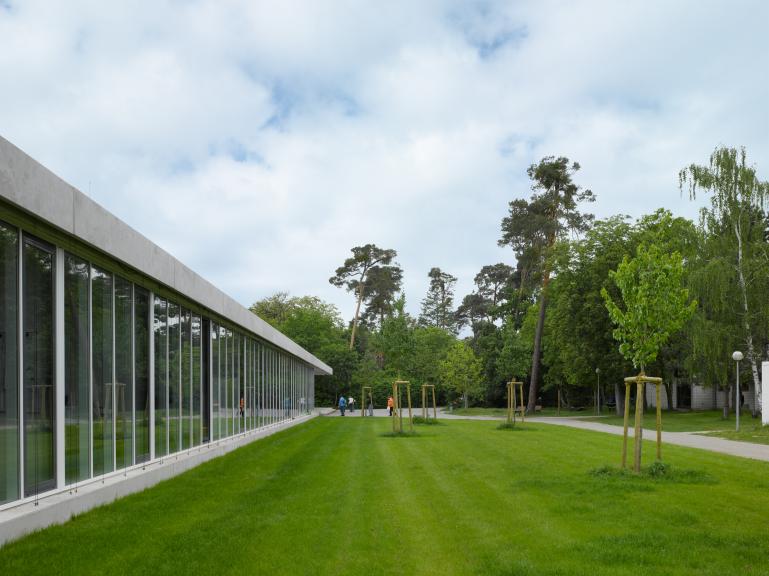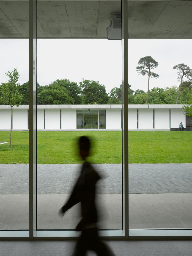 Prägendes Element der Anlage sind die Sichtbetonplatten der Decke und des Bodens. Zwischen diesen Elementen befinden sich weiß lackierte Stahlbeton-Hohlwände und Stahlstützen.