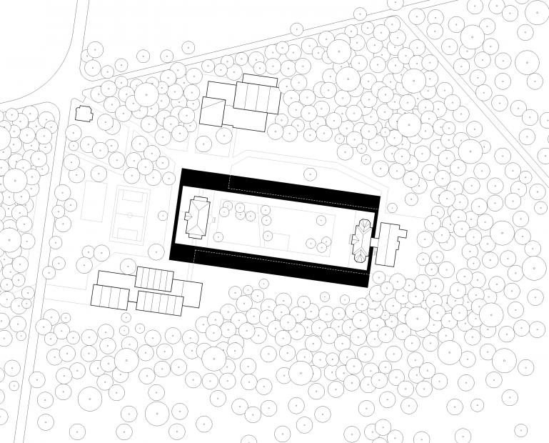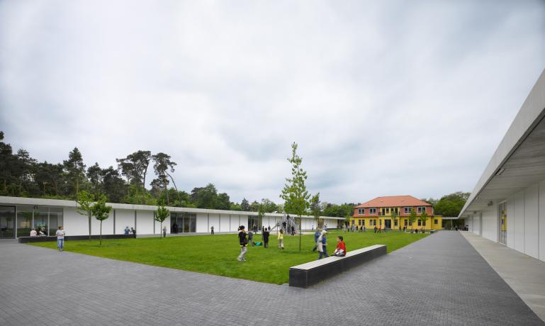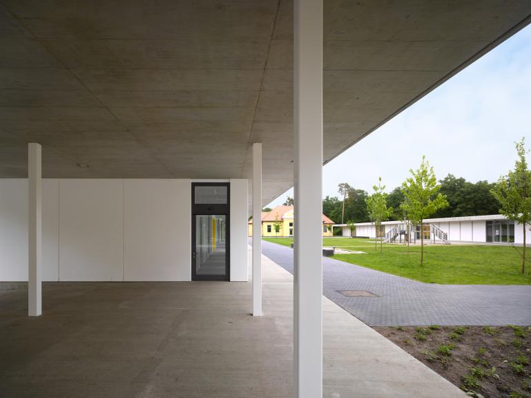Das zentrale Motiv des Entwurfs ist der wie eine Lichtung aus dem Wald „geschnittene“ Freiraum, der als gemeinschaftlicher und gut überschaubarer Innenhof konzipiert und weitgehend als frei bespielbare Grünfläche mit wenigen markanten Bäumen gestaltet ist. Der Hof wird durch die zwei eingeschossige Klassentrakte von Unter- und Mittelstufe sowie die Kopfbauten der ursprünglichen Anlage gebildet.