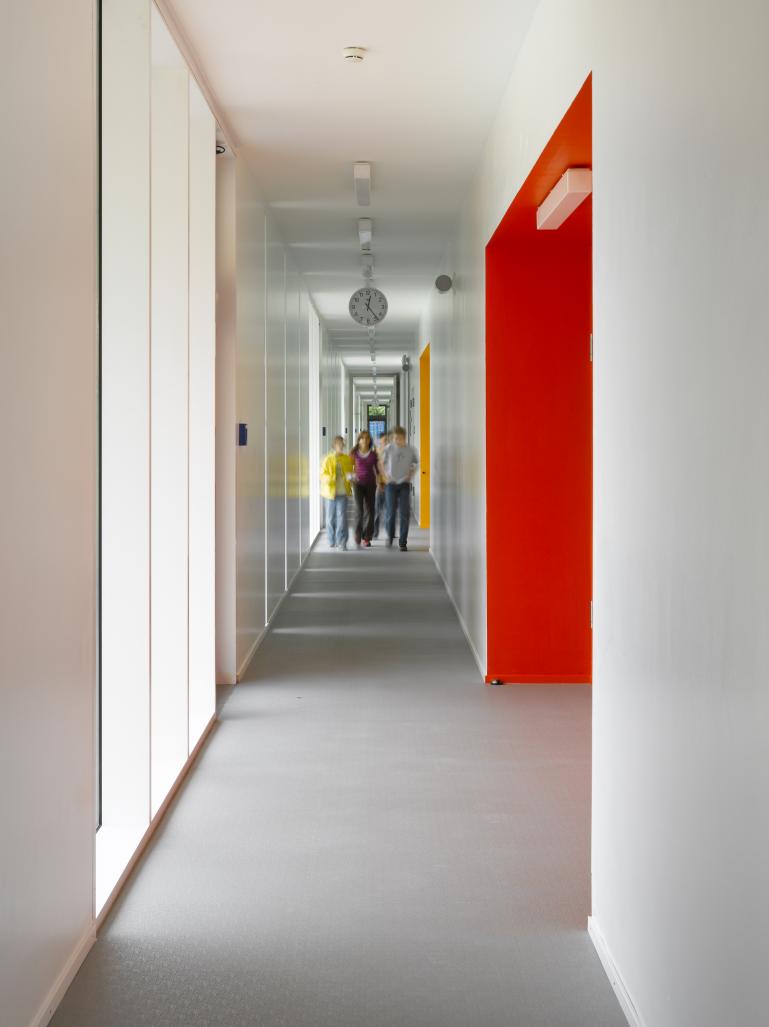 Ein umlaufender Laubengang verbindet alle Teile barrierefrei und weitet sich bei dem neu geordneten Vorplatz zu einem Eingangsbereich auf, der gleichzeitig als überdachter Schülerwartebereich für den Bustransfer dient.