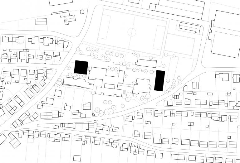 Der Entwurf sieht vor, die in Zusammenhang mit steigenden Schülerzahlen neu benötigten Funktionen – Mensa und Klassenzimmer – baulich zu trennen. Das Mensagebäude bildet als eingeschossiger Baukörper den Abschluss des Schulgrundstückes nach Osten hin. Der Speisesaal, der auch als Veranstaltungs- und Aufenthaltsraum genutzt werden soll, wird zum hangseitig liegenden Schulhof hin orientiert.