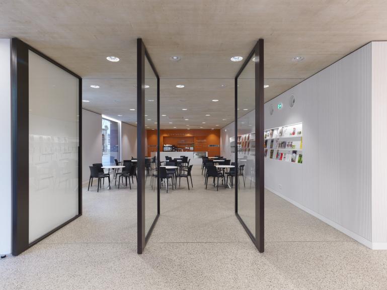 An der Schnittstelle zwischen mittelalterlicher Altstadt und bischöflichem Palais sollte eine neue Stadtbibliothek entstehen, die darüber hinaus an prominenter Stelle als Treffpunkt für die Bürger dienen sollte. Entstanden ist ein kommunizierender Baustein im städtischen Gefüge. Kommunikation wird auf dieser stadträumlichen Ebene so verstanden, dass Themen der Umgebung aufgenommen, interpretiert und neu wiedergegeben werden. So kann etwas Neues entstehen, dessen „genetischer Code“ aus der Umgebung gespeist wird. Der Baukörper für die Stadtbibliothek wurde in Anlehnung an die geknickte Bauform des Nachbargebäudes entwickelt. So entsteht ein räumlicher Dialog.