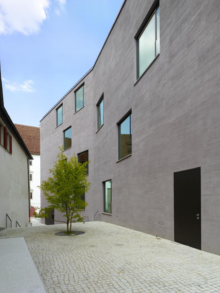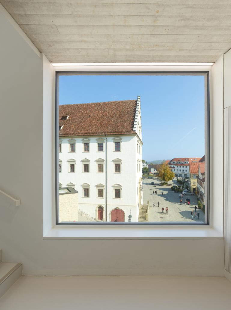 Das Grundstück liegt an der Schnittstelle ganz unterschiedlicher Maßstäblichkeiten. Die verschiedenen Traufhöhen des Neubaus – bedingt durch das gerade Satteldach auf der geknickten Gebäudeform – können zwischen dem imposanten bischöflichen Palais und den niedrigeren Gebäuden der Altstadt vermitteln. Die umfassenden Innenwände sind im Sinne einer Bibliothek weitgehend mit Regalen belegt. Unterbrochen werden diese durch große Fenster mit tiefen Leibungen, die zum Sitzen und Lesen geeignet sind. Die Leser in den Fenstern werden von außen sichtbar und transportieren so die Funktion des Hauses in den öffentlichen Raum. Von innen bietet jedes der Lesefenster einen eigenen, gerahmten Blick in die Stadt.