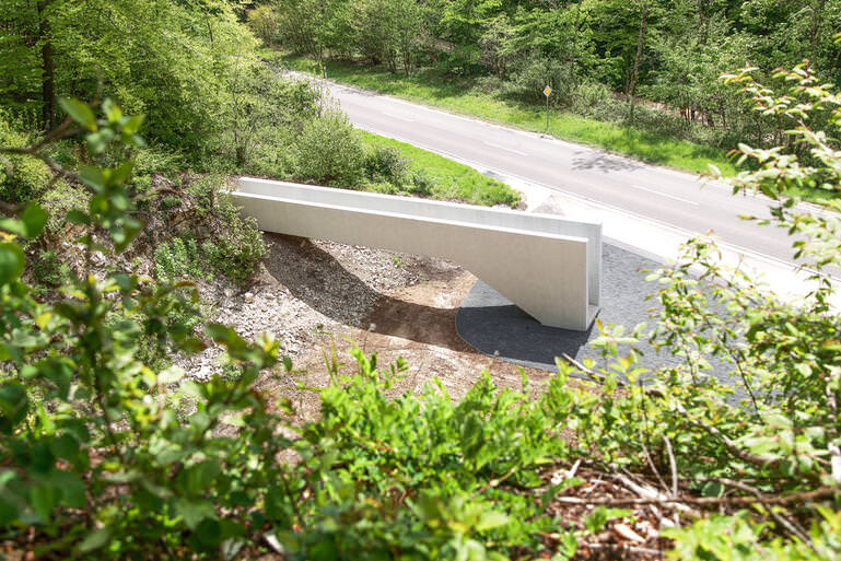 Das Bauwerk wirkt homogen und skulptural. Als weißes, offensichtlich begehbares Objekt aus lasiertem Beton steht es im deutlichen Kontrast zu den durchweg dunklen Schattierungen des Ortes - dem Asphalt der Straße, dem Fels des Steinbruchs und den Bäumen des Waldes.