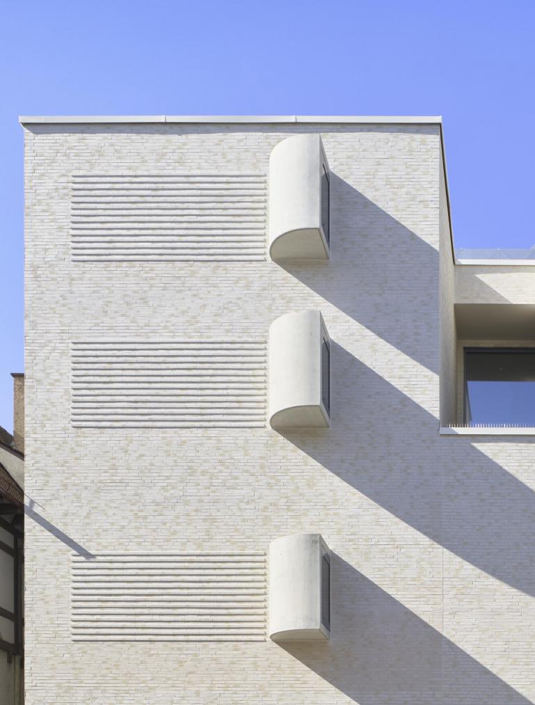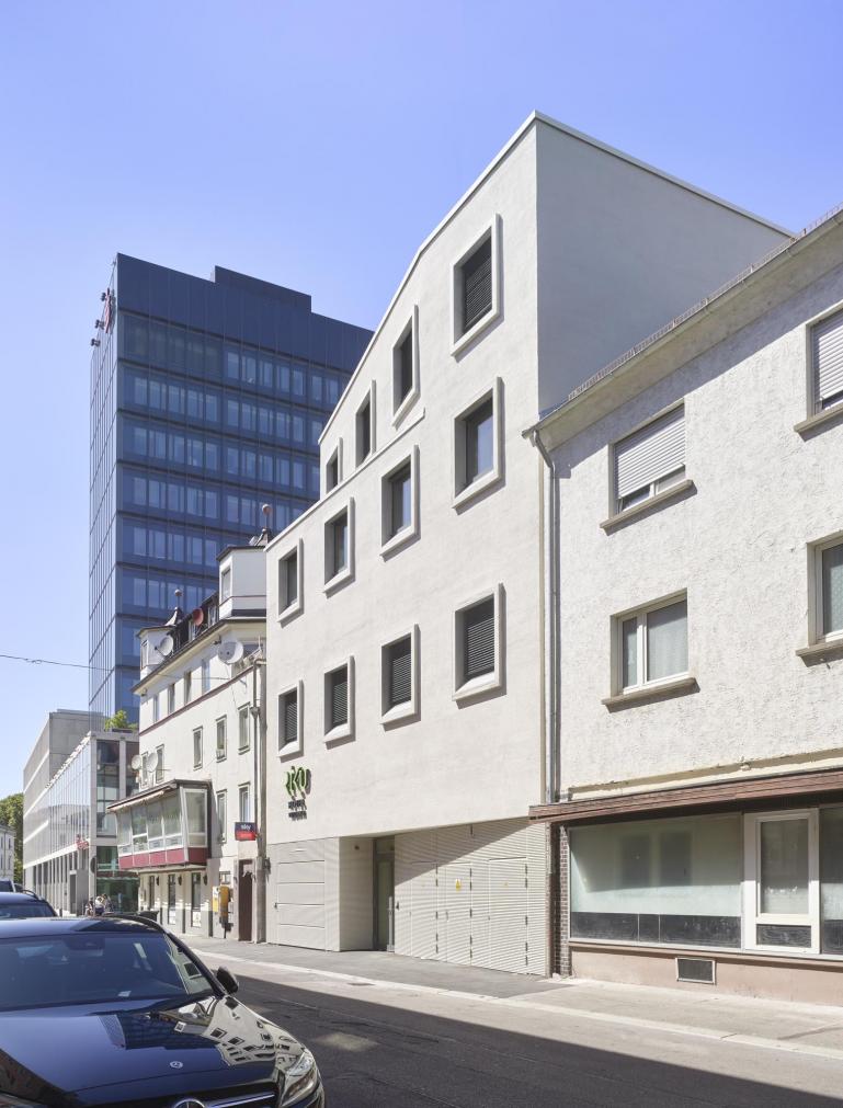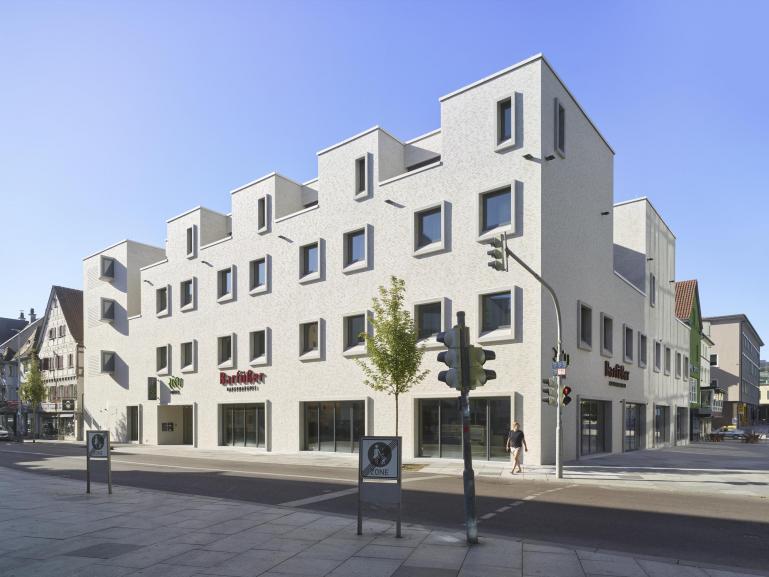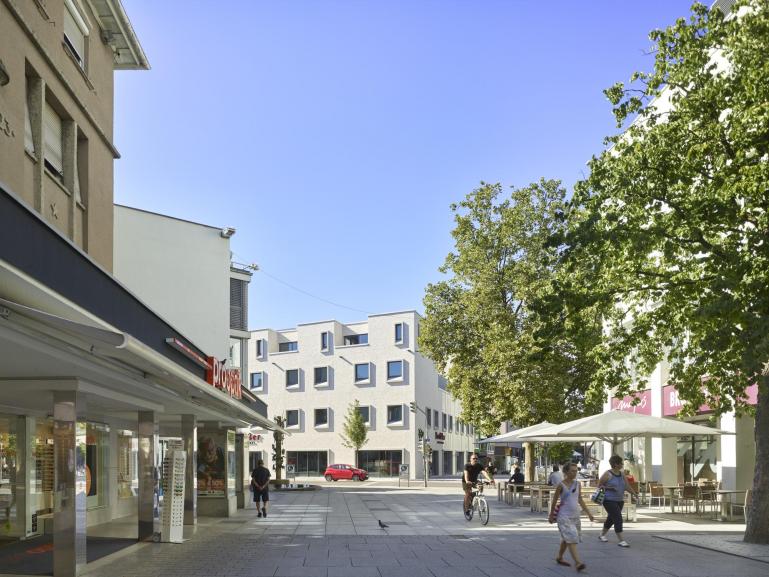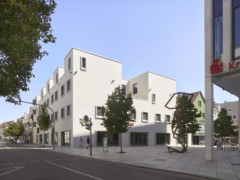 Der Neubau für das „Zentrum untere Marktstraße“ muss aus stadträumlicher Sicht scheinbar widersprüchlichen Ansprüchen genügen: Einerseits sollte er als Bindeglied zwischen Bahnhofsplatz und Marktstraße eine starke räumliche Präsenz ausstrahlen. Auch das Gegenüber zur maßstäblich dominanten Sparkasse verlangt nach einer markanten Antwort.