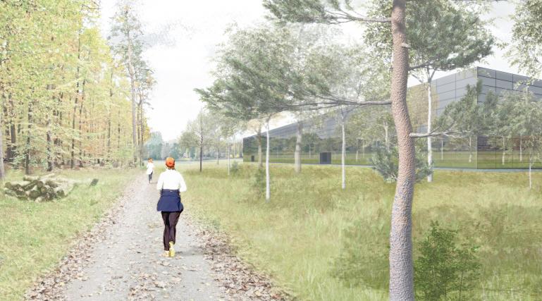 Die Reduktion auf das Minimum ist das Leitthema des Entwurfes. Erstens unter dem Gesichtspunkt eines sparsamen Umgangs mit den Ressourcen (Landschaft, Energie, Raum,...) und zweitens im Sinne einer Ästhetik, die das Thema des Einfügens in einen Landschaftsraum, in diesem Fall den Berliner Stadtwald, auf die Spitze treibt.