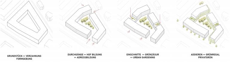 "Die Verfasser schlagen eine durchgängige 5-geschossige Blockrandbebauung vor. Der Blockrand wird bewusst durch zwei Fugen getrennt und geöffnet. Eine zu öffentliche Durchwegung des Innenhofs wird durch die Orientierung der Wohnungen abgemildert. Der Kubus wird durch zwei weitere Einschnitte gegliedert, die zusätzlich Dachterrassen für die Bewohner bilden. Das Abknicken des Gebäudes im Nordwesten ist für die Qualität der Wohnungen sehr gut nachvollziehbar. Der vorschlagen Treffpunkt im Südosten des Realisierungsteils ist städtebaulich gut gewählt und wird logisch ergänzt durch eine Cafénutzung im Erdgeschoss."