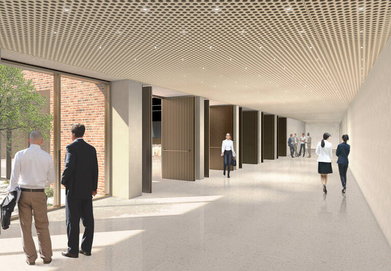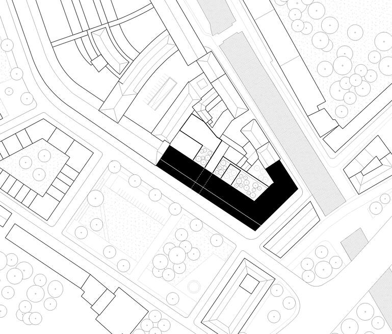 Situation und Programm gründen auf einem hohen Maß an Heterogenität und Komplexität. Leitgedanke des Entwurfs ist, die Situation durch eine weitgehende Homogenisierung von Bestandsgebäuden und Ergänzungen zu beruhigen. Die Bestandsgebäude werden auf die reine Konstruktion rückgebaut. An der kleinen Kurstraße werden zudem die Gebäudevorsprünge an der Ecke sowie im Erdgeschoss entfernt. Somit werden die beiden Baukörper straßenseitig im Sinne einer homogenen Randbebauung vereinfacht. Diese Maßnahmen dienen alle der Umsetzung des Leitgedankens, den Rand zu stärken und die Mitte offen zu halten. So entsteht eine relativ einfache Gesamtfigur, die eine gute Orientierung ermöglicht und optimale Voraussetzungen für die natürliche Belichtung der nach Innen orientierten Nutzflächen bietet.