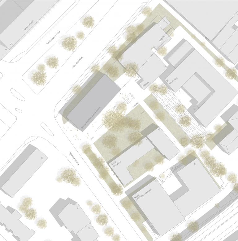 „In selbstverständlicher Weise gelingt es dem Verfasser, das neue Schulgebäude sowohl an den vorhandenen Schulstandort an der Luruper Hauptstraße anzubinden als auch von der Flurstraße städtebaulich zu definieren. Ein neuer Pausenhof verknüpft die Bestandsschule und den Schulneubau und bildet gleichsam einen angemessenen Vorplatz für die Schule.“