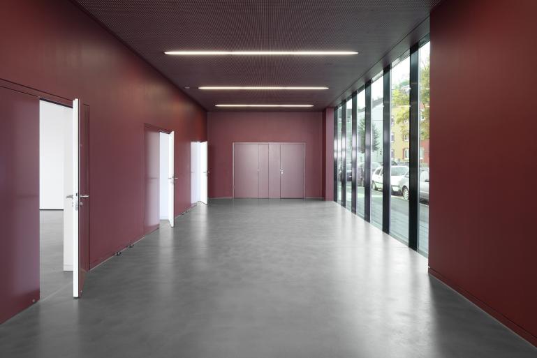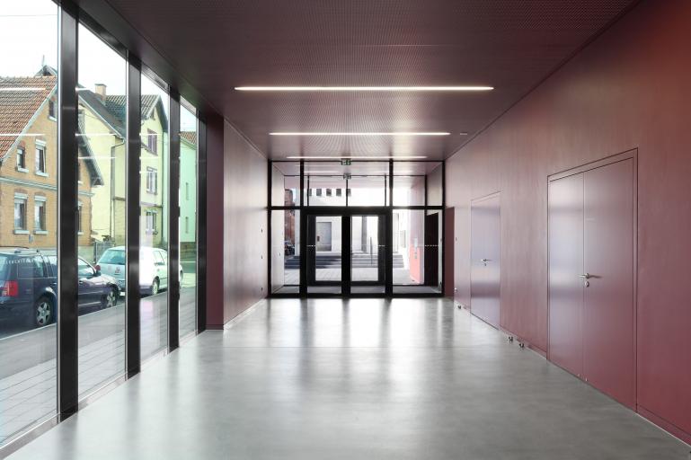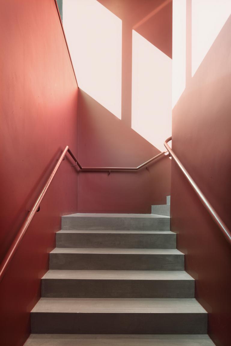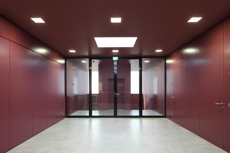Farbig gestaltete Oberflächen führen von Außen nach Innen und verbinden die Erschließungsbereiche in allen Geschossen. Aus dem erdigen Rot der Erschließung tritt man in die hellen Aufenthaltsräume.