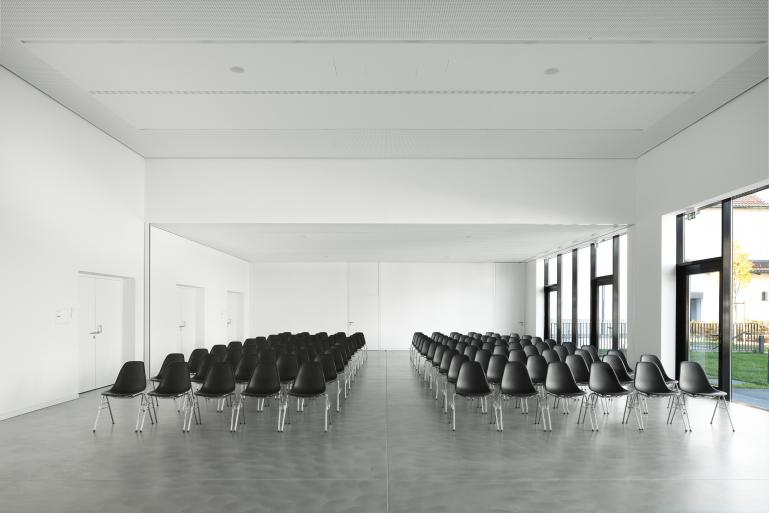 Im Inneren des neuen Gemeindehauses befindet sich ein großer Saal, der mithilfe von mobilen Trennwänden in zwei kleinere Säle unterteilt werden kann. Die Säle und das großzügige Foyer können von der Küche direkt bewirtet werden.