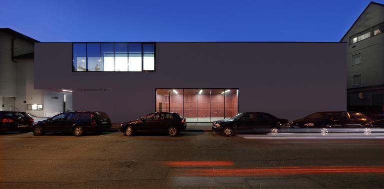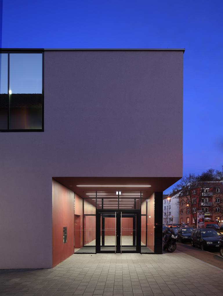 Der klare Baukörper ist als eigenständiges Element in die heterogene Straßenbebauung eingefügt und baut durch die Ausrichtung des Eingangs eine starke Beziehung zur Kirche auf. Durch die weitgehende Schließung des Straßenraums schirmt der Neubau den Freiraum im rückwärtigen Bereich des Grundstücks vom Straßenlärm ab.