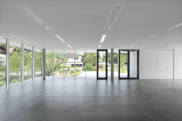 Mithilfe von mobilen Trennwänden kann der Großraum in vier Räume unterteilt werden und ist damit flexibel für unterschiedliche Gruppen nutzbar. Die dienenden Funktionen Küche, Stuhllager und Sanitärbereich sind in massiven Kernen um den Saal angeordnet. Die Küchentheke kann für Bewirtungszwecke über Schiebewände zum Saal geöffnet werden. Ein Balkon mit anschließender Terrasse erweitert im Sommer die Nutzfläche für Gemeindeveranstaltungen.