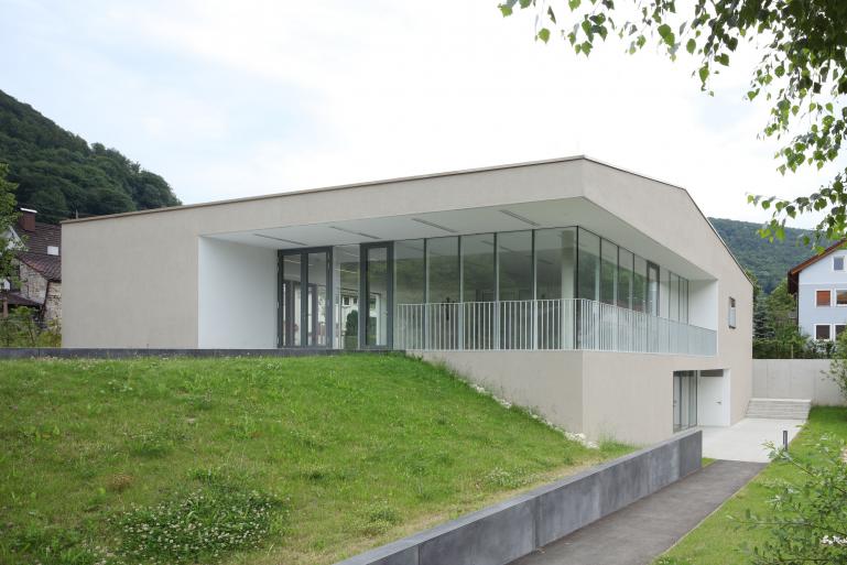 Das Gebäude ist als kompakter Körper entwickelt, der durch Gebäudeeinschnitte skulptural gestaltet wird. Die Fassade zeigt sich fugenlos in rauem, sandfarbenem Putz. Das ruhige Weiß der Innenräume tritt durch die Behandlung der Gebäudeeinschnitte mit glatten, weißen Putzflächen nach Außen in Erscheinung.