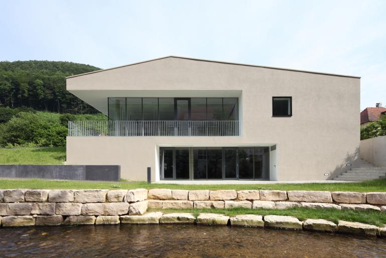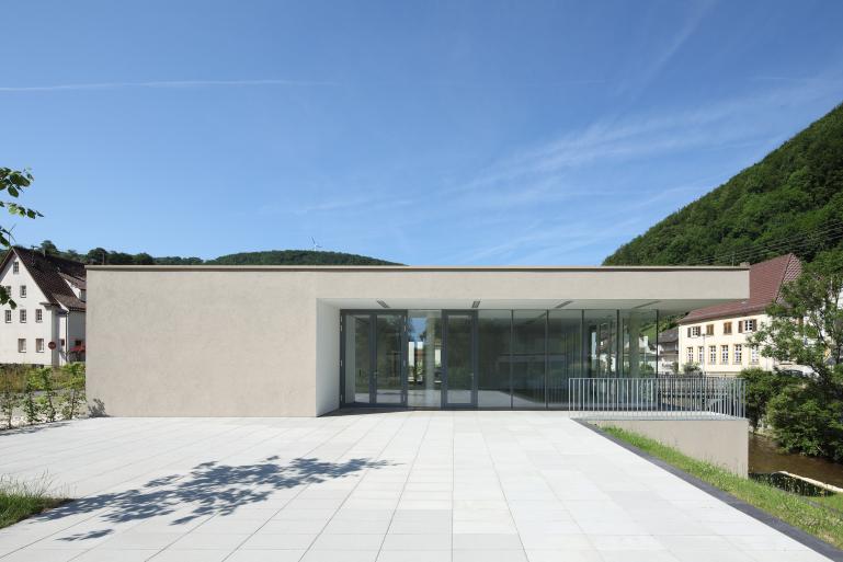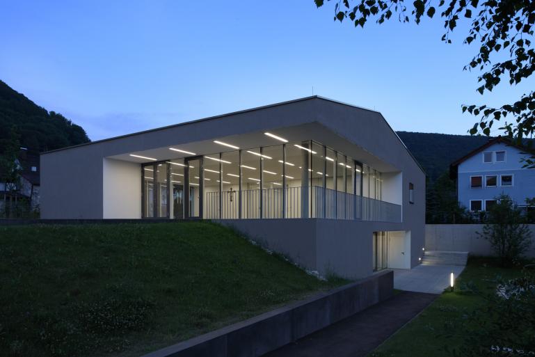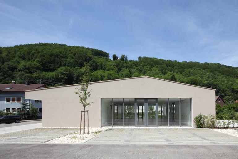 Im Inneren befindet sich als Hauptfunktion ein großer Saal, der sich über großzügige Glasfassaden nach Außen zur umgebenden Schwäbische Alb öffnet.