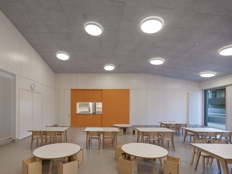 Das Gebäude ist in drei „Häuser“ gegliedert: Ein Haus für Kleinkinder U3, ein Haus für Kindergartenkinder Ü3, ein Haus für gemeinsame und öffentliche Funktionen. Jedes Haus ist nach dem gleichen Prinzip strukturiert: