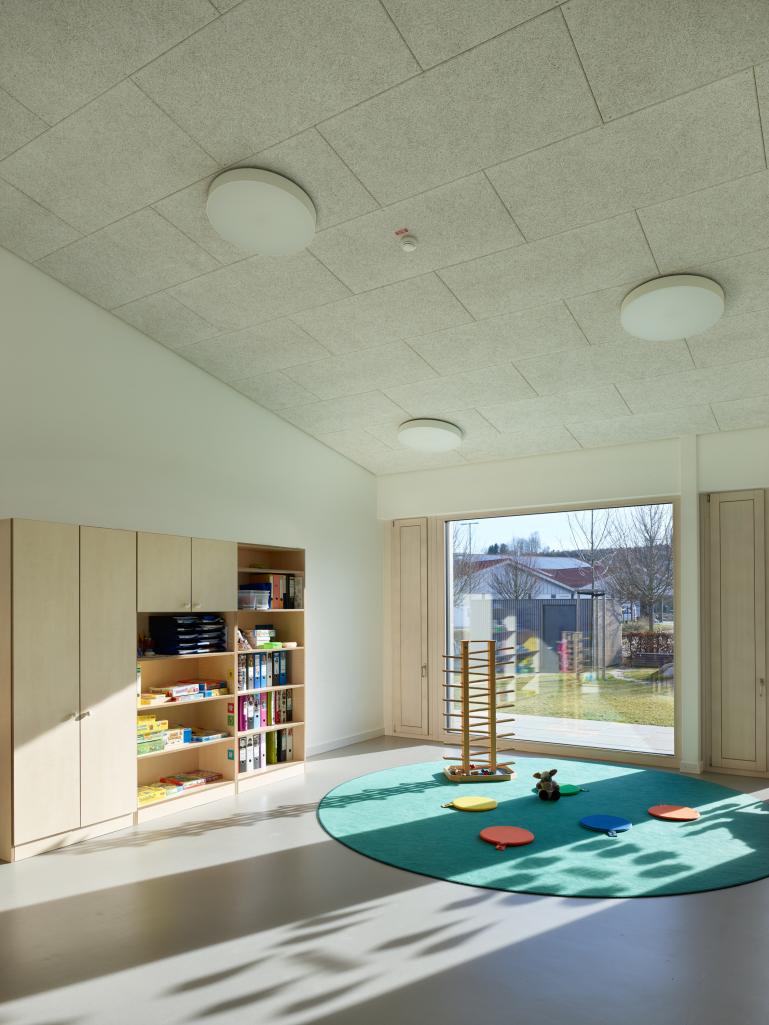 Das Baumaterial Holz gewährleistet eine kostengünstige und schnelle Konstruktion des Hauses. Holz als warmes, lebendiges Material ist der ideale Hintergrund für ein vielfältiges Kindergartenleben und bindet alle Bereiche optisch zusammen. Große Fensterflächen mit niedriger Brüstung sorgen für die optimale Belichtung der Räume in voller Tiefe. Ein Bezug zum Außenraum auf Kinderhöhe ist gewährleistet.