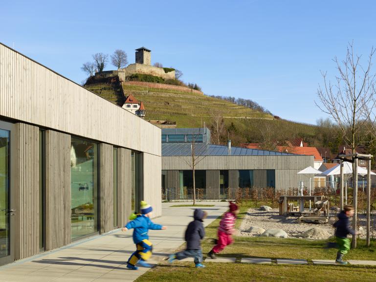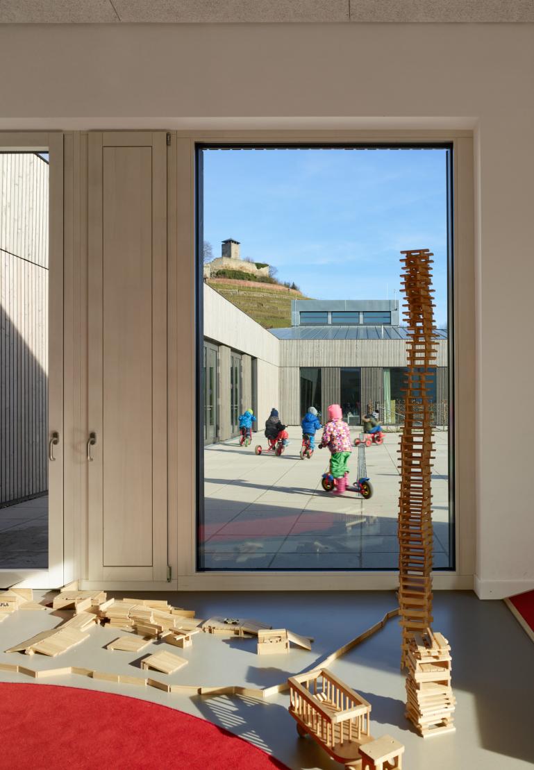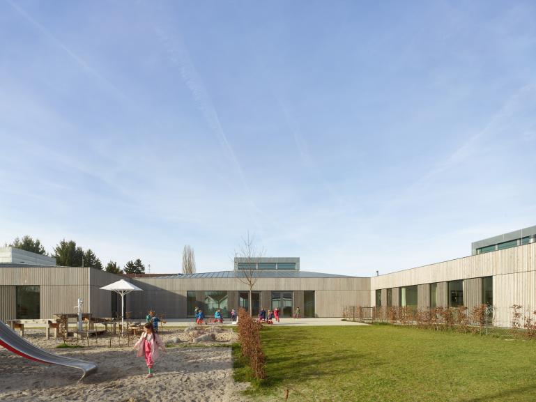 In der heterogenen Umgebung zwischen Altstadt, Wohnbebauung und Gewerbegebiet vermittelt der Neubau durch seine differenzierte Gliederung zwischen flächigen und kleinteiligen Strukturen. Die markante Dachform und das Fassadenmaterial Holz sorgen dabei für eine eigenständige Identität und eine klare Adressbildung im Kontext. Der für einen Kindergarten beträchtliche Umfang des Raumprogramms wird durch die Unterteilung in „Häuser“ maßstabsgerecht gegliedert; die Nutzungsbereiche sind von außen ablesbar.