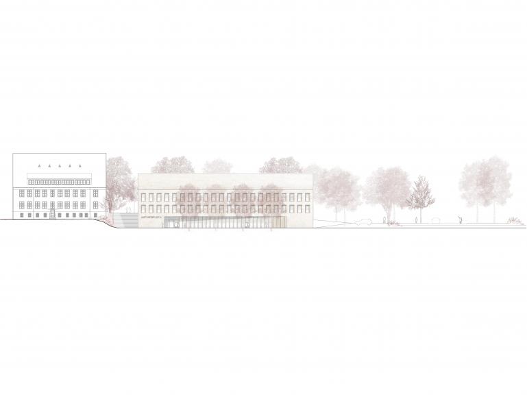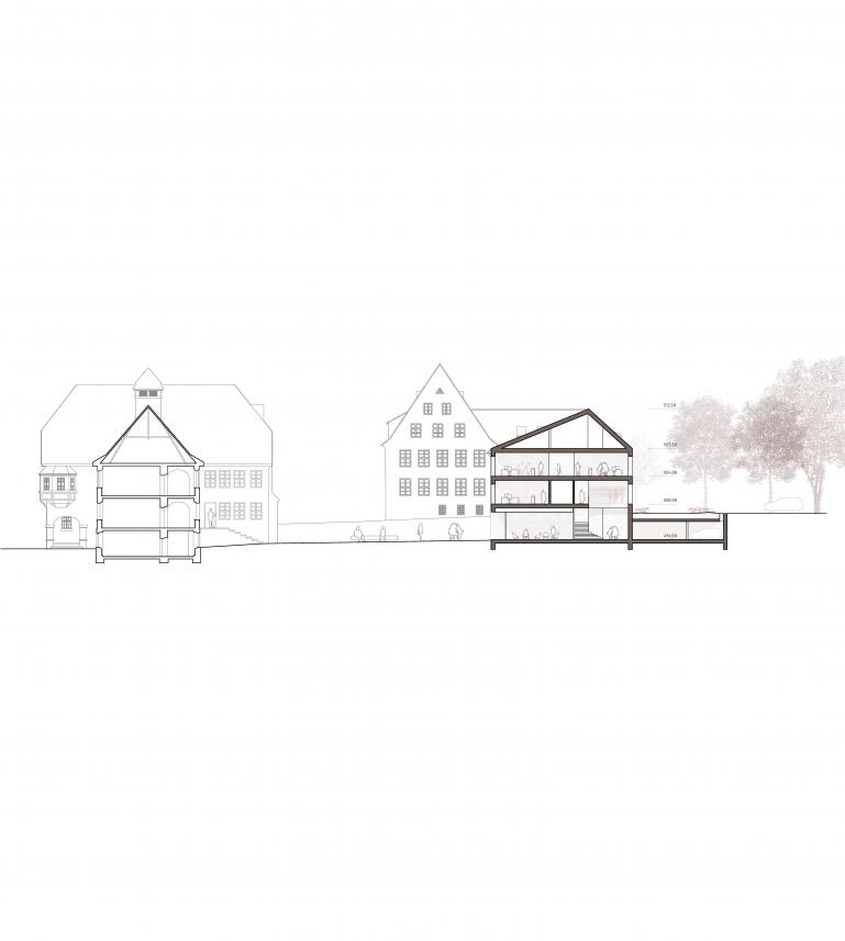 Die Ausrichtung des neuen Baukörpers parallel zum Amtsgebäude 3 schaffte einen neuen, autofreien Hof mit hoher Aufenthaltsqualität, der sich im Charakter vom Vorplatz zum Hauptgebäude abhebt. Er hält dabei ausreichend Abstand zum denkmalgeschützten Gebäude und gleichzeitig funktionale Nähe zum westlich angrenzenden Amtsgebäude 2.