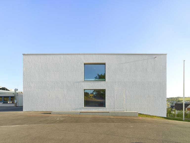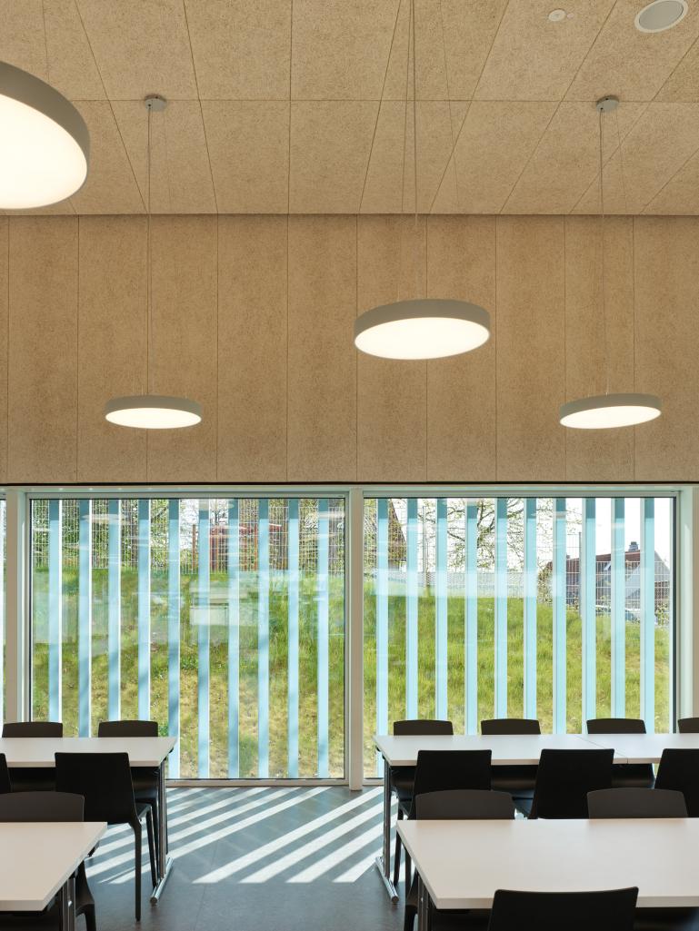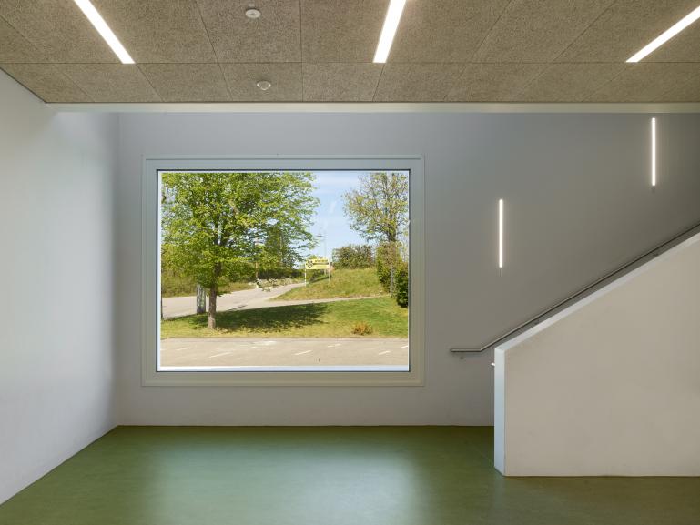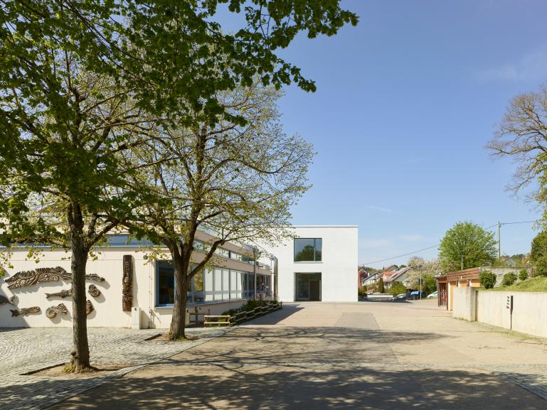 Das Mensagebäude erhält an Windfang und Speisesaal eine großzügige Öffnung zum Schulhof hin. Besonderes gestalterisches Detail ist die Ausführung der Fassade im unteren Bereich mit Metallverkleidung und Verglasung und im oberen Bereich mit Putz mit Besenstrich wie beim Klassenzimmergebäude. Der sich dadurch bildende Horizont wird auch im Innenraum aufgenommen. Im Klassenzimmergebäude wird das Treppenhaus mit dem Flur zu den Klassenzimmern zusammengelegt. Zur Belichtung des inneren Bereiches dieser Foyerfläche wird im Gruppenraum eine große Glastüre vorgesehen. Die Klassenzimmer orientieren sich zur Süd/Westseite.