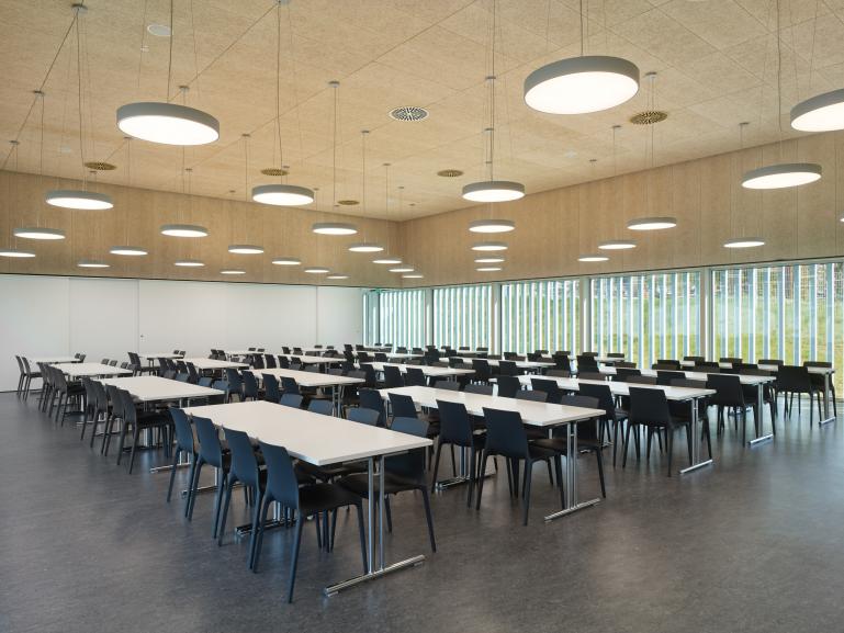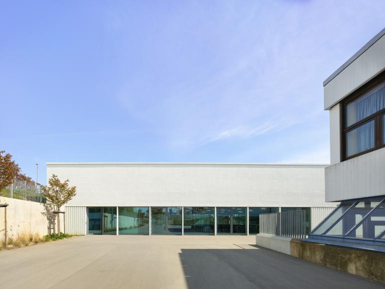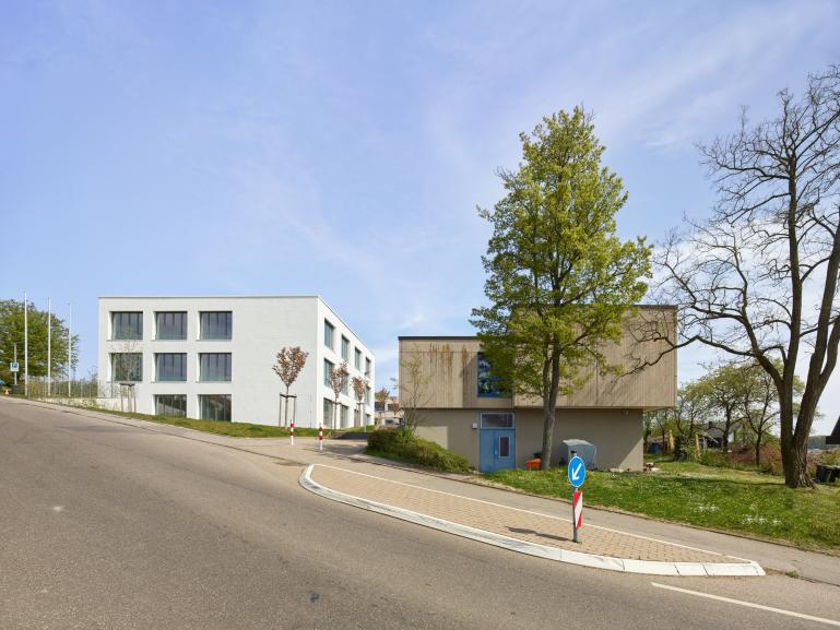 Der Entwurf sieht vor, die in Zusammenhang mit steigenden Schülerzahlen neu benötigten Funktionen – Mensa und Klassenzimmer – baulich zu trennen. Das Mensagebäude bildet als eingeschossiger Baukörper den Abschluss des Schulgrundstückes nach Osten hin. Der Speisesaal, der auch als Veranstaltungs- und Aufenthaltsraum genutzt werden soll, wird zum hangseitig liegenden Schulhof hin orientiert.