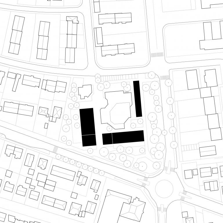 Eine rechteckige Fläche markiert und verortet das Terrain des Ensembles mit dem Kirchengebäude in der Mitte. An den Rändern formulieren vier 2-3-geschossige Baukörper das Karree.