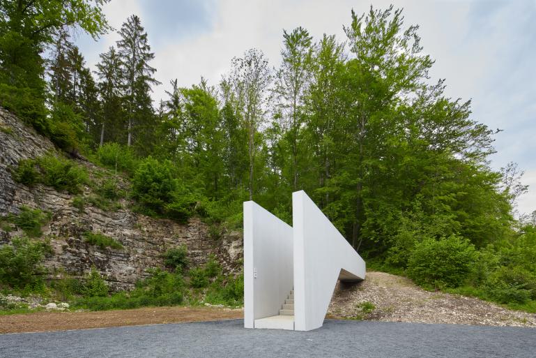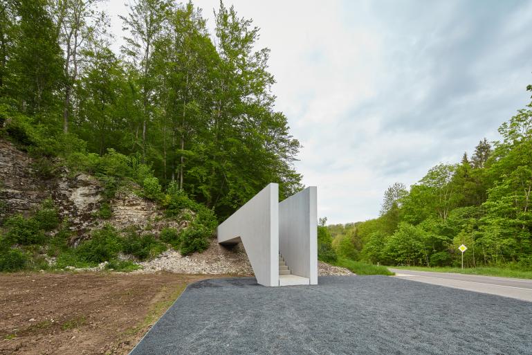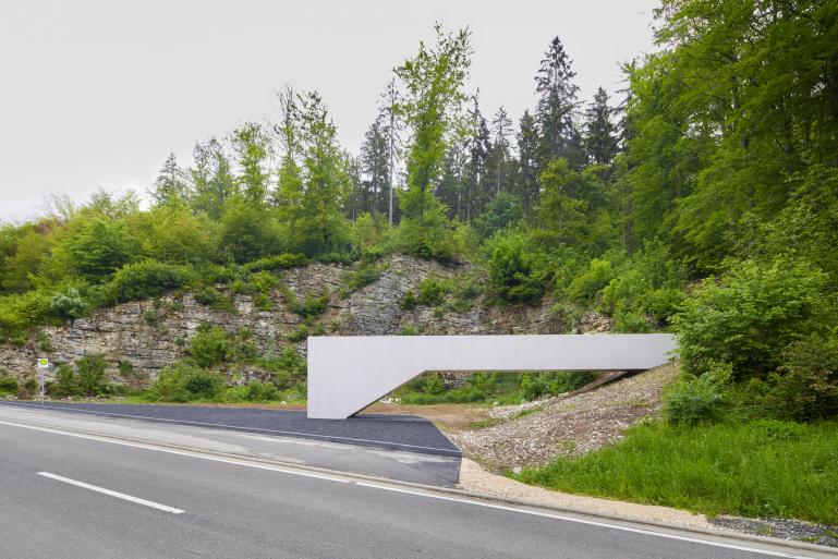 Das Bauwerk wirkt homogen und skulptural. Als weißes, offensichtlich begehbares Objekt aus lasiertem Beton steht es im deutlichen Kontrast zu den durchweg dunklen Schattierungen des Ortes - dem Asphalt der Straße, dem Fels des Steinbruchs und den Bäumen des Waldes.