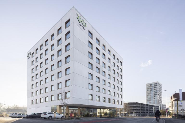 Die Schöller Firmengruppe beabsichtigt den Bau eines Hotels in zentraler Lage neben dem Reutlinger Hauptbahnhof. In Abstimmung mit der Stadt soll des Weiteren ein Mobilitätszentrum mit Radturm und Fahrradabstellplätzen vor dem ebenfalls neu zu erstellenden städtischen Platz westlich des Bahnhofs entstehen. Durch die Zusammenfassung der beiden Nutzungseinheiten Hotel und Mobilitätszentrum zu einem Baukörper kann ein großzügiger, städtischer Platz mit hohem Aufenthaltswert freigehalten werden. Beide Nutzungen stellen städtebauliche Akzente durch Hochpunkte her, die über einen Sockel miteinander verbunden sind. Dieser Sockel macht sich die topographischen Gegebenheiten zu Eigen und ermöglicht so eine sinnvolle und flächeneffiziente Aufteilung der Zugänge. Im Erdgeschoss des Hotels befindet sich der Empfang mit Foyer, sowie ein großer Frühstücks- und Loungebereich mit Bar und angeschlossener Kaltküche. Verwaltung und Service sind im rückwärtigen Bereich untergebracht. In den 7 Obergeschossen befinden sich die Hotelzimmer mit 20 Doppelzimmern je Geschoss.